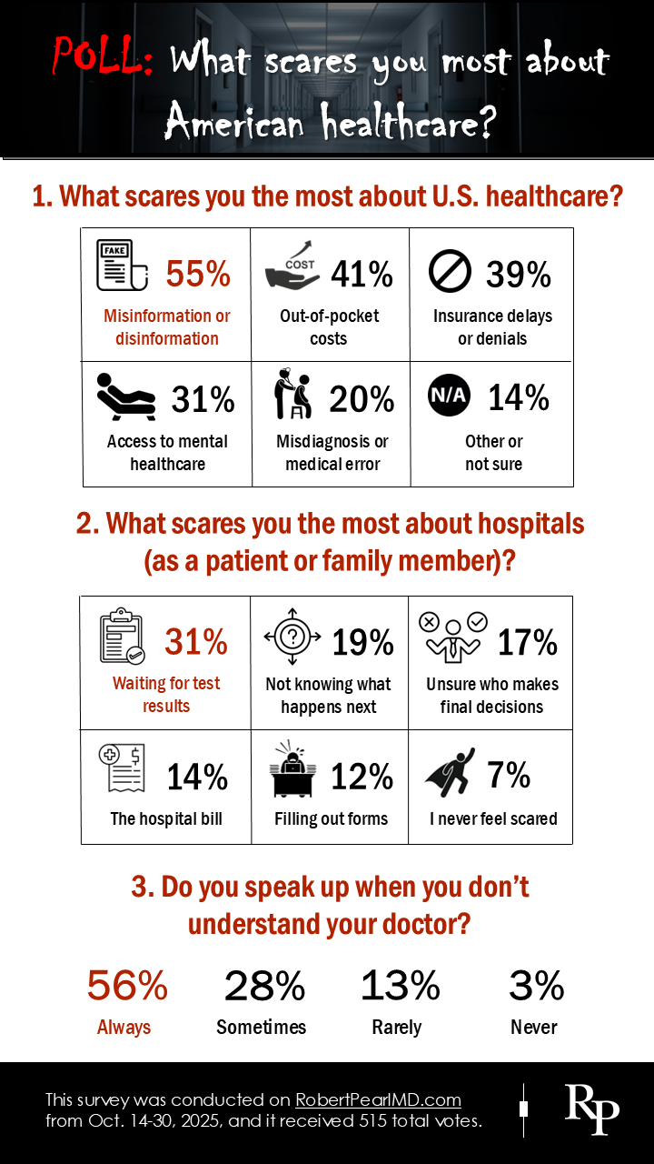 My thoughts: Three themes stand out from these results. First is the dominance of misinformation. Nearly half of respondents said it is what scares them most (not hospital bills, insurance denials or even medical errors). They’re right. Misinformation spreads faster than facts and has become a public health threat of its own.